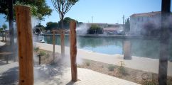 Frontignan ist eine wunderschöne Stadt. Zu sehen ist das öffentliche Versprühen von Wasser als sehr feinen Nebel, um sich mal so einfach abkühlen zu können.